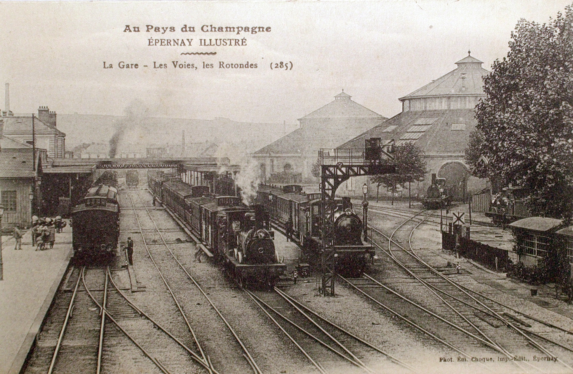 La gare, les voies de chemin de fer, les deux rotondes et les locomotives à vapeur.